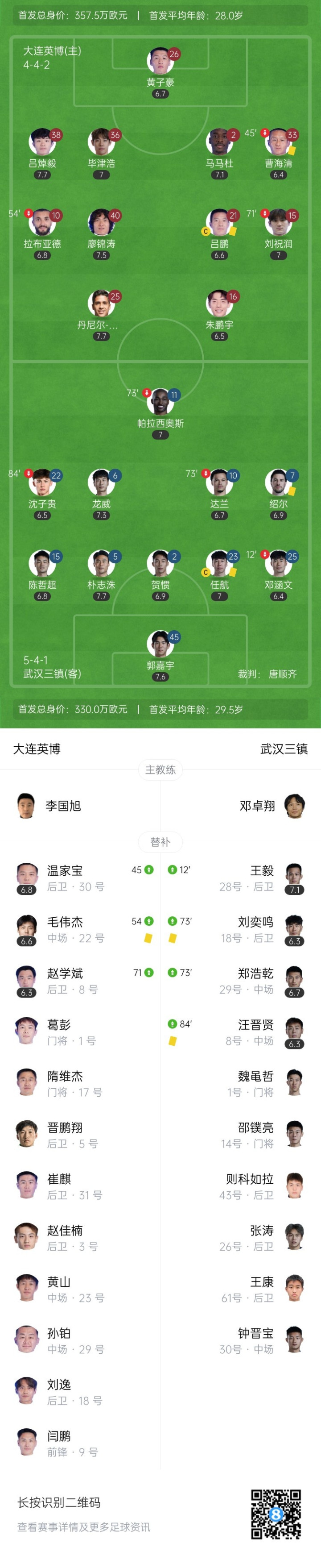 直播吧10月19日讯中超第27轮,大连英博坐镇主场中升梭鱼湾足球场迎战武汉三镇。上半场,刘祝润、朱鹏宇造险,邓涵文伤退。易边再战,马马杜造险+中楣,龙威门线解围,郭嘉宇神扑救主。最终大连英博0-0武汉三镇。积分榜方面,大连英博四轮不胜34分仍第十,武汉三镇25分第十二。