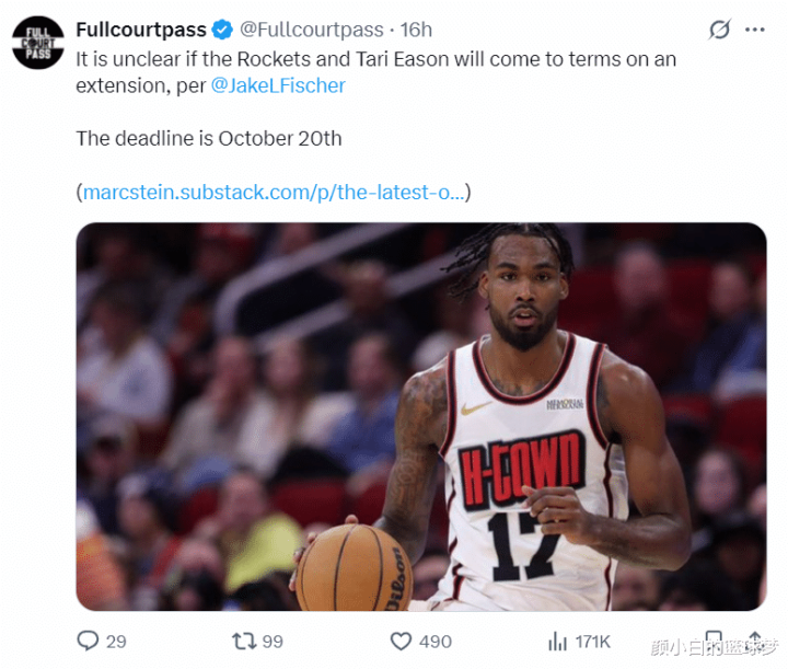 北京时间9月28日,根据BR记者杰克-费舍尔的报道,火箭队与塔里-伊森的提前续约陷入僵局,目前尚不得知火箭队是否会在今夏续约伊森,续约的截止日期是10月20日。
