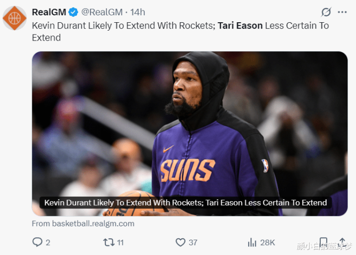 随后美媒RealGM也透露,凯文-杜兰特大概率会跟火箭达成提前续约,但伊森能否与火箭达成提前续约还不确定,杜兰特的续约优先级实际上已经高于伊森。
