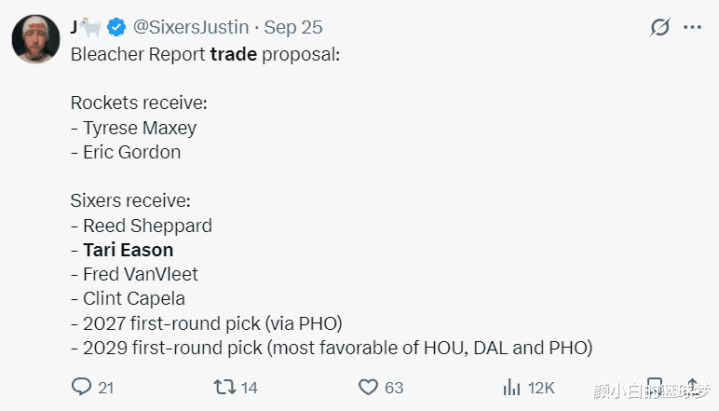《露天看台》则建议费城与火箭交易,费城送出马克西、戈登从火箭方面换来谢泼德、伊森、范弗利特、卡佩拉、27年太阳首轮、29年火箭/独行侠/太阳顺位更高首轮。(12月15日进行)