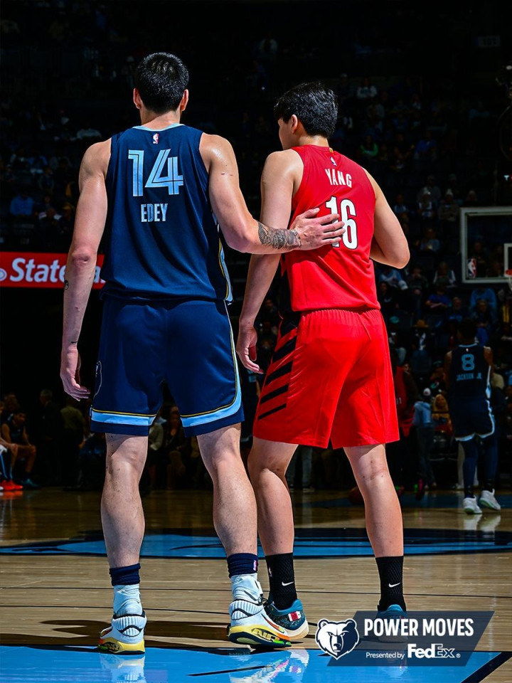 灰熊官方晒出晒伊迪和杨瀚森的对位图,并附文:“统治力十足!”